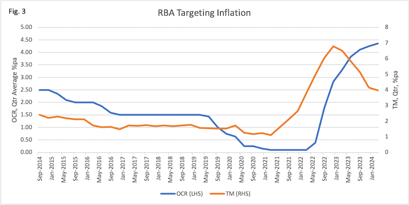 Figure 3 shows inflation was below 2.5 per cent for 29 quarters between September quarter 2014 and September quarter 2021. Over this period the RBA decreased the OCR without any obvious impact on inflation.3